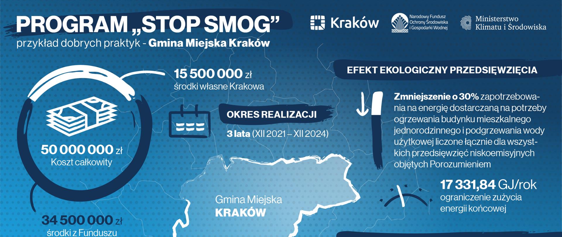 W ciągu trzech lat, Kraków – zasilony 34,5 mln zł dofinansowania z Funduszu Termomodernizacji i Remontów w ramach programu „Stop Smog” – planuje zrealizować 944 przedsięwzięcia niskoemisyjne, w ramach których liczba wymienionych nieefektywnych źródeł ciepła wyniesie 756, a budynków poddanych termomodernizacji – 289. Poza wsparciem, które przekazuje Narodowy Fundusz Ochrony Środowiska i Gospodarki Wodnej, miasto wyłoży na ten cel 15,5 mln zł jako wkład własny.