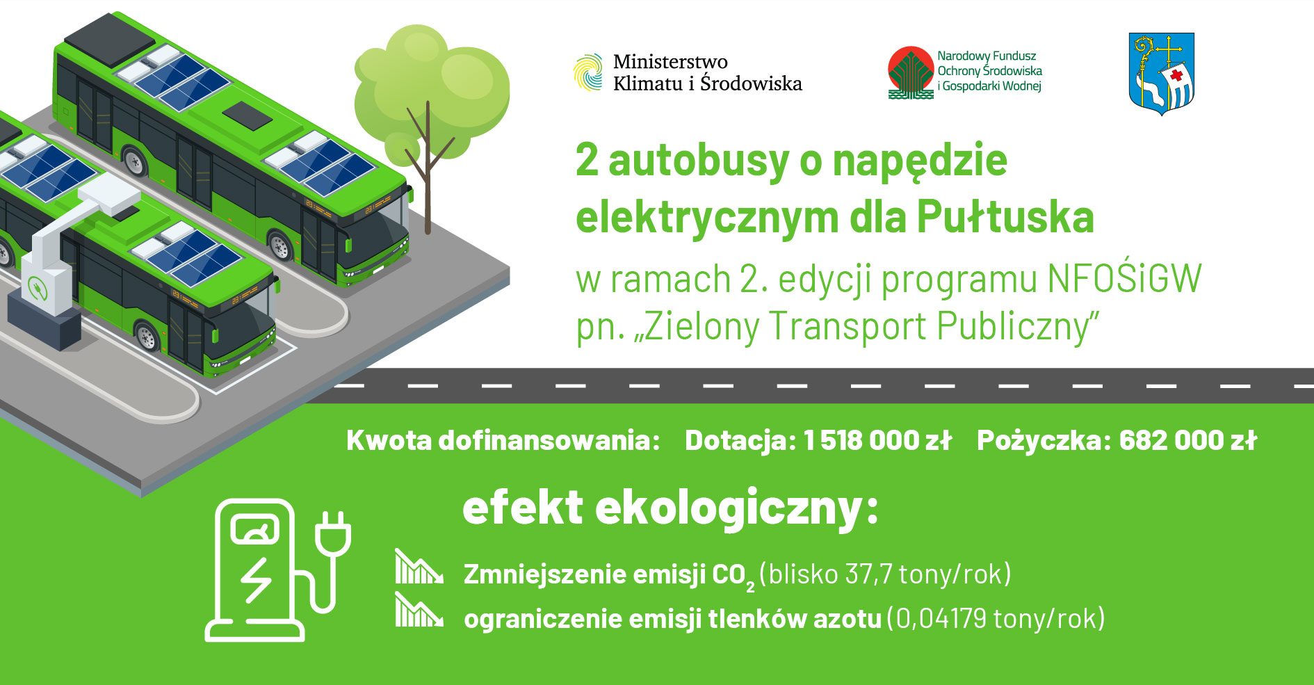 Inwestycja zostanie zrealizowana w ramach drugiej edycji programu priorytetowego „Zielony Transport Publiczny”, którego celem jest obniżenie wykorzystania energii i paliw emisyjnych w publicznym transporcie zbiorowym i rozwój w Polsce „zielonej” mobilności. Narodowy Fundusz Ochrony Środowiska i Gospodarki Wodnej przekaże gminie Pułtusk dofinasowanie w wysokości prawie 1,52 mln zł (dotacja) i 682 tys. zł (pożyczka). Za te pieniądze zostaną zakupione dwa autobusy o napędzie elektrycznym.