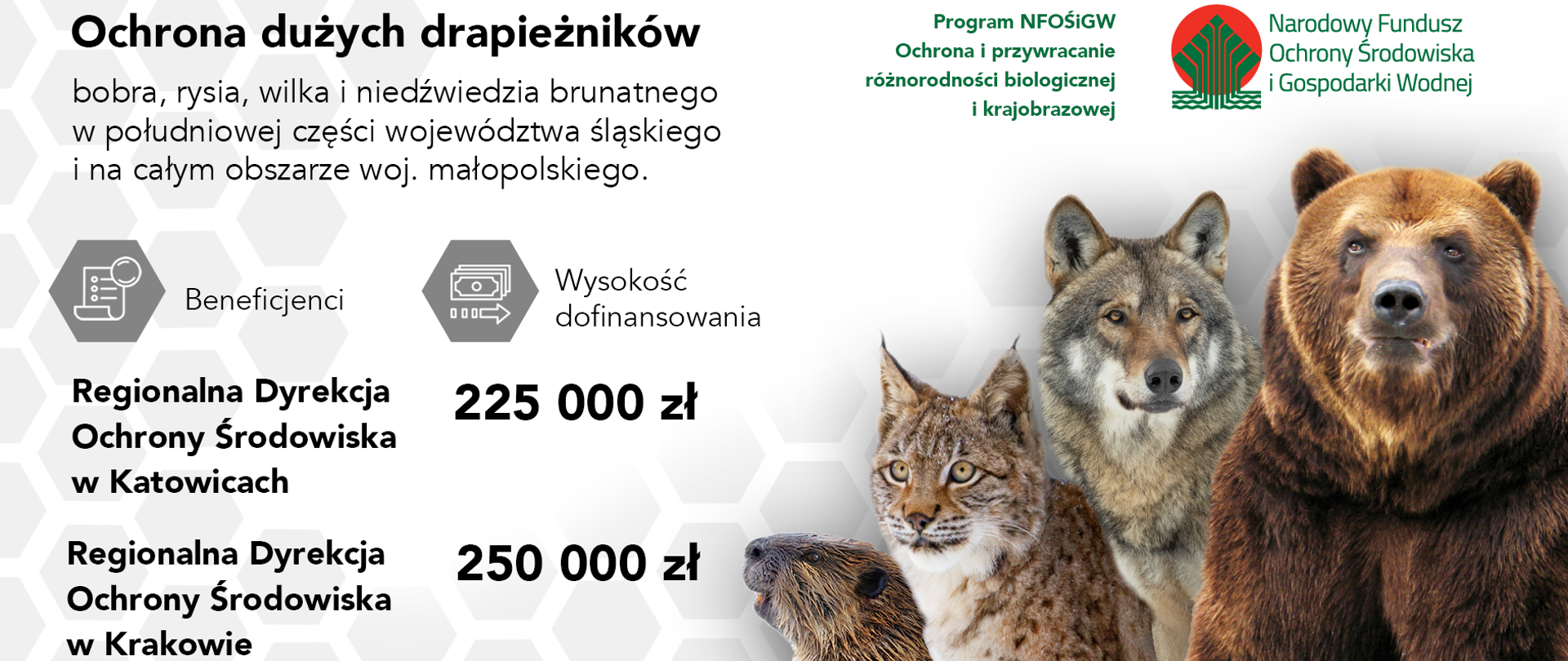 Przy wsparciu finansowym z NFOŚiGW zostaną zrealizowane inicjatywy pn. Ochrona dużych drapieżników: niedźwiedzia brunatnego, wilka i rysia w południowej części województwa śląskiego oraz Zarządzanie populacjami gatunków chronionych powodujących szkody - stosowanie materiałów zabezpieczających przed szkodami: zakup siatki i pastuchów elektrycznych. Przedsięwzięcia mają spowodować poprawę stanu ochrony populacji dużych drapieżników na południu Polski, poprzez ograniczenie występowania sytuacji konfliktowych między nimi a człowiekiem, przeciwdziałanie synantropizacji drapieżników, ale i przeciwdziałanie ewentualnym szkodom wyrządzonym przez zwierzęta.