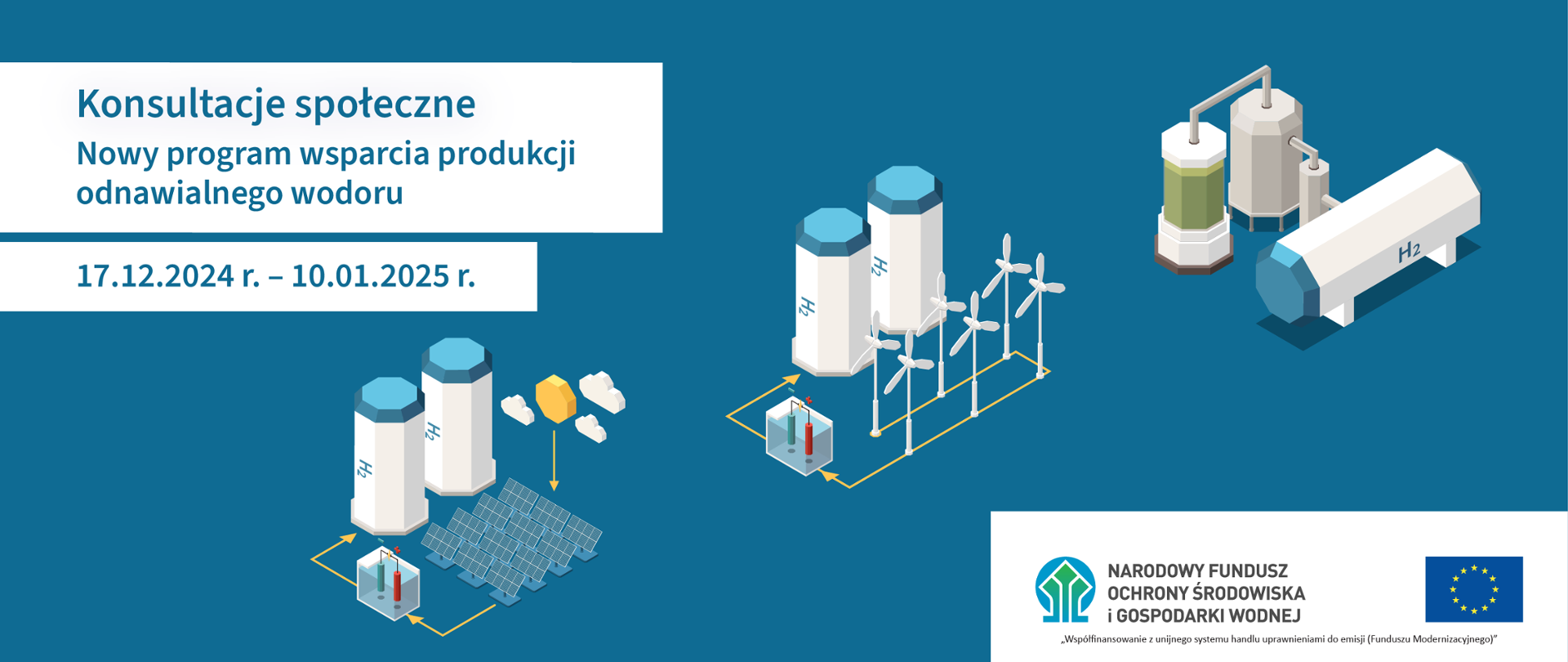 Narodowy Fundusz Ochrony Środowiska i Gospodarki Wodnej przedstawia ankietę konsultacyjną dotycząca wsparcia produkcji wodoru odnawialnego (RFNBO). Opinie i uwagi pozwolą lepiej dopasować założenia nowego programu priorytetowego „Rozwój zdolności produkcyjnych odnawialnego wodoru” do aktualnych potrzeb i wyzwań branży wodorowej.