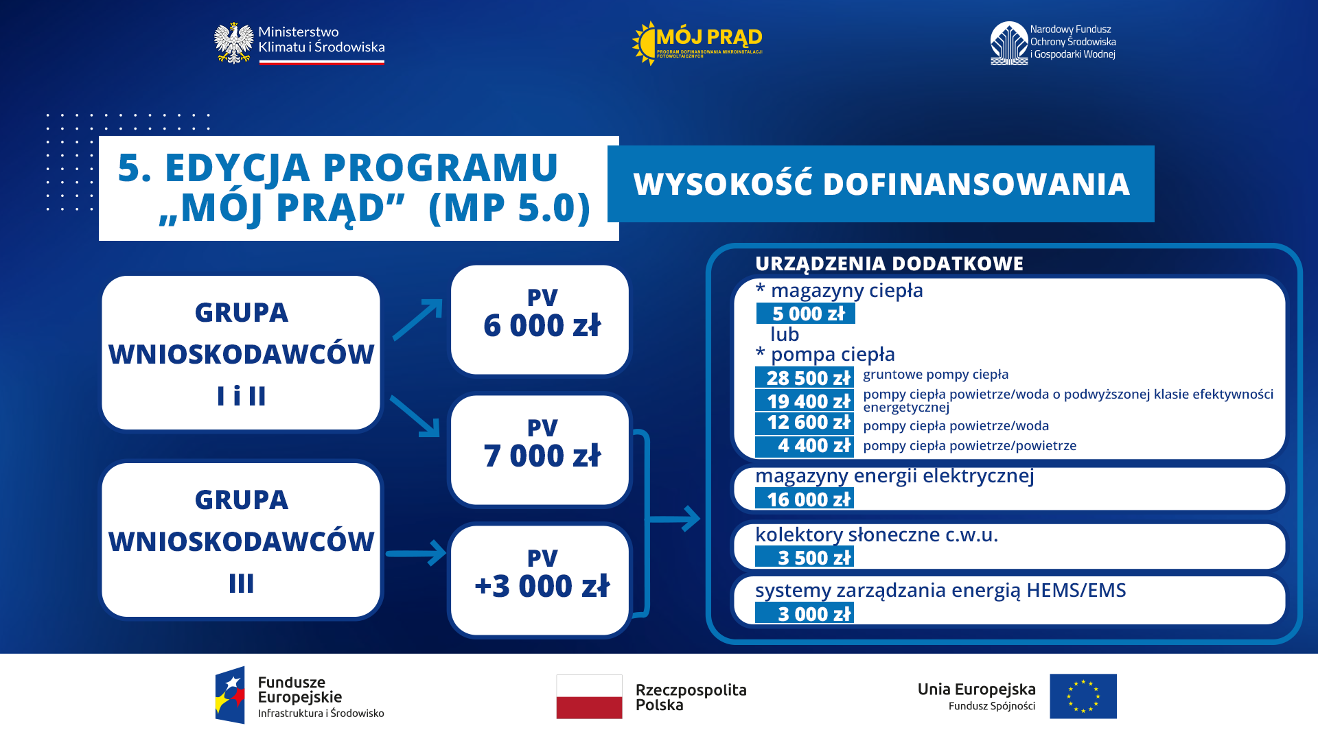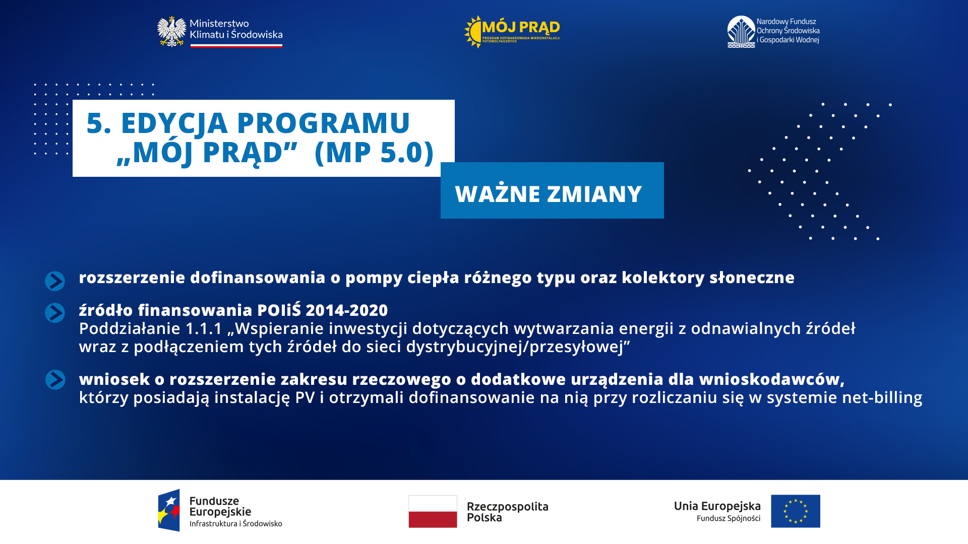 Ministerstwo Klimatu i Środowiska wraz z Narodowym Funduszem Ochrony Środowiska i Gospodarki Wodnej informują, że 22.04.2023 r. o godz. 9.00 uruchomiony zostanie piąty nabór wniosków o dofinansowanie w programie „Mój Prąd” (PPMP5).